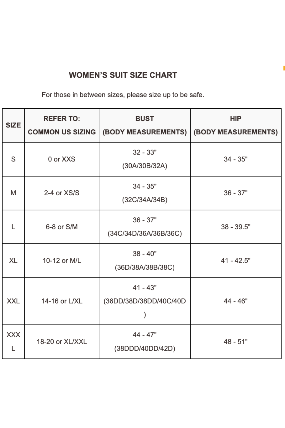 WOMEN’S SUIT SIZE CHART